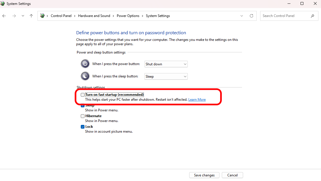 In the Power Options window, on the left-hand panel, click on Choose what the power buttons do. Then, disable 'Turn on fast startup'