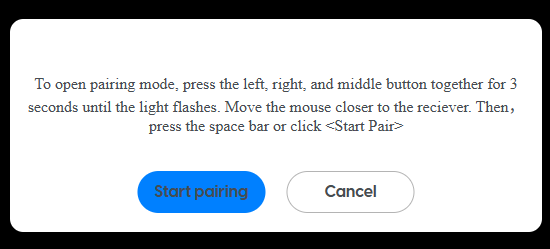 Move your mouse close to the receiver. Then, press the left, right and middle buttons together for three seconds (make sure the ON/OFF switch on your mouse is ON!); you’ll see the mouse light flash. Then, press the space bar (if you do not have a spare mouse) or click ‘Start pairing.’