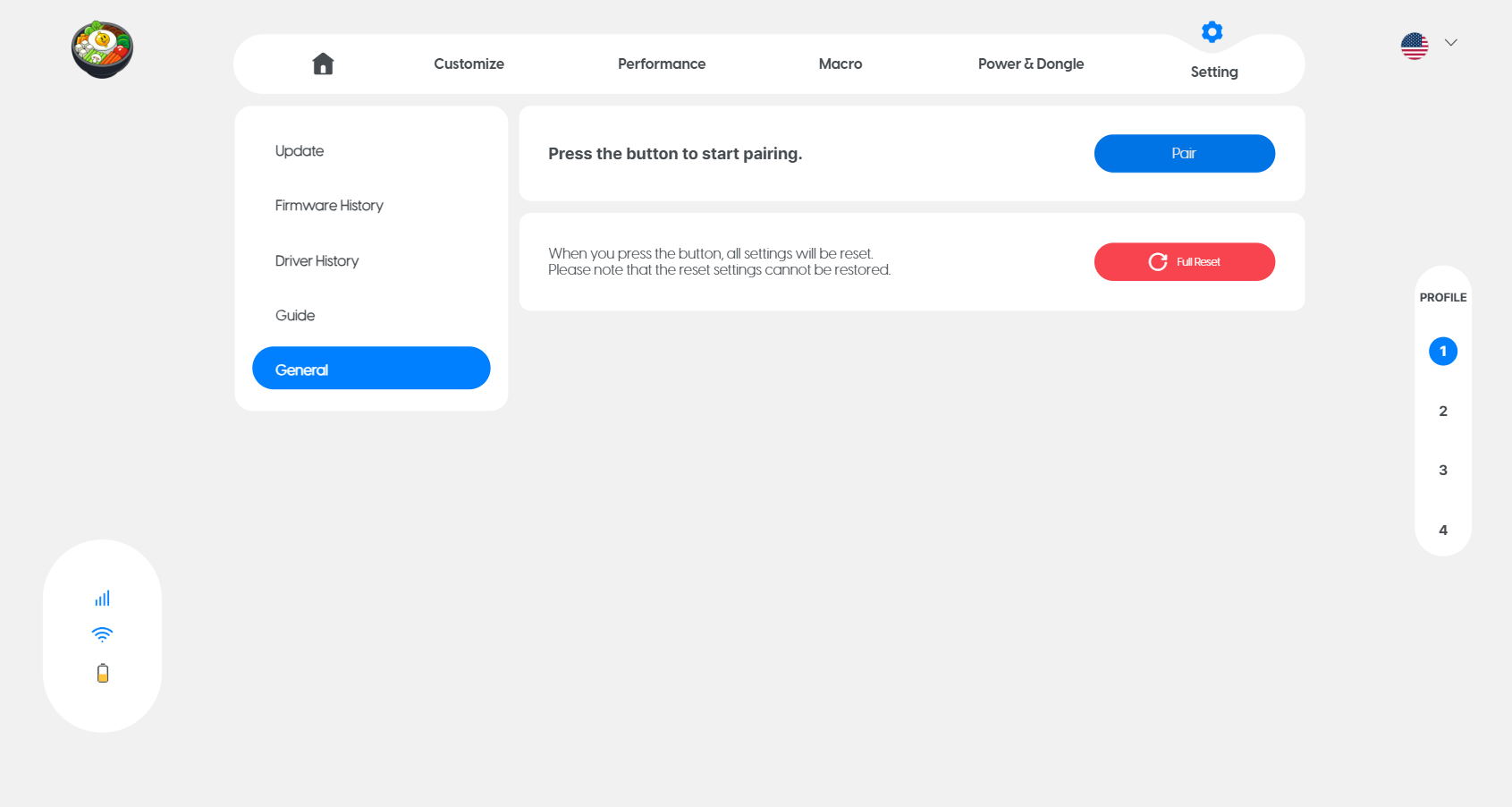 You can also pair mouse and dongle again after opening the settings on Bibimbap. You can go to 'Setting' on the top right corner of the screen, then click 'General', and finally click on the 'Pair' button.